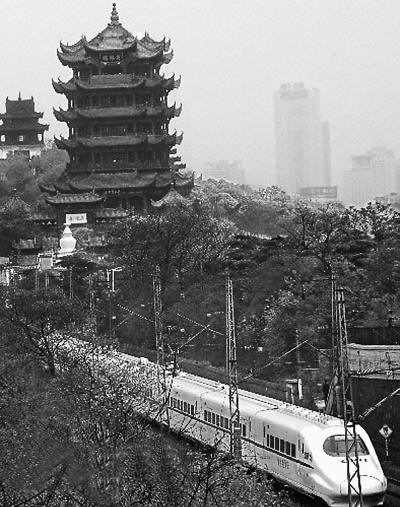 “子弹头”列车穿行于武汉黄鹤楼下的绿色走廊