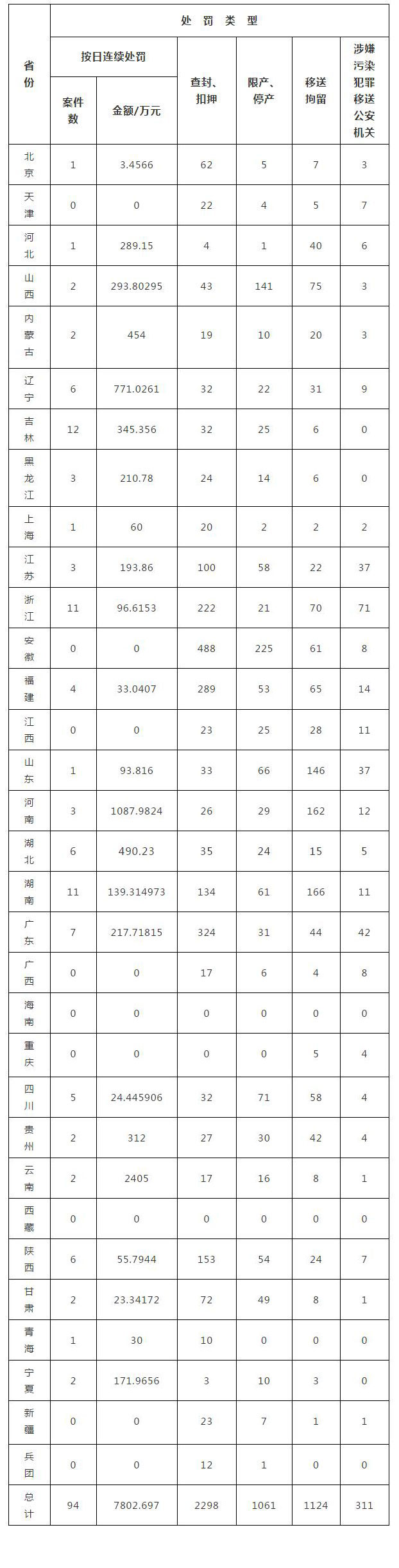 环保部环境监察局局长田为勇介绍说,1-5月,全国实施五类案件总数13478件。其中,按日连续处罚案件共392件,罚款数额达51062.34万元;查封扣押案件6030件;限产停产案件2999件;移送行政拘留3062起;涉嫌犯罪移送公安机关案件995起。