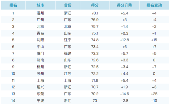 突出进展之二,是 14城得分70分以上,较上年度翻了一番。温州、广州、北京、青岛、杭州、宁波继续保持在70分之上,沈阳、中山、厦门、济南、苏州、上海、绍兴、东莞也进入70分以上行列。PITI指数中法律法规要求的信息公开占70分,意味着这些领先城市已经基本做到依法公开。