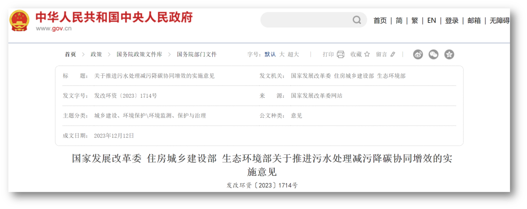 国家发展改革委 住房城乡建设部 生态环境部关于推进污水处理减污降碳协同增效的实施意见发改环资〔2023〕1714号各省、自治区、直辖市、新疆生产建设兵团发展改革委、住房和城乡建设厅 (委、管委、局)、生态环境厅 (局) :