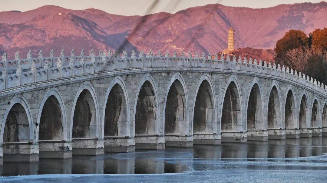 在描摹西湖美景的同时,乾隆皇帝也将各地的名园胜景汇聚于园中。如谐趣园内的知鱼桥、玉琴峡,与无锡寄畅园的知鱼槛、八音涧有异曲同工之妙。连接南湖岛和东堤的十七孔桥,原型是仿照卢沟桥,有17个桥拱,中间的桥拱为第九个,与皇帝“九五至尊”的寓意相应,桥上望柱仿照卢沟桥的狮子,据说数量比卢沟桥还多了几十只。万寿山北侧的“四大部洲”,仿照的范本是西藏最古老的寺庙——桑耶寺,其布局形式体现了藏传佛教的宇宙观。这些著名的景致,使得这座北方的园林融汇了南北山水的灵性和文化意趣。