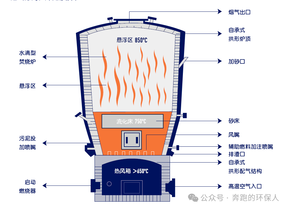 苏伊士污泥焚烧技术,核心为鼓泡式流化床焚烧炉Thermylis,又名流化拱床炉,其整体结构如下图: