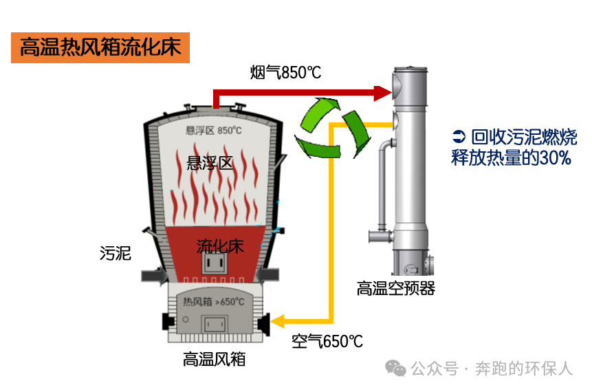 第三代焚烧炉技术,是在第二代流化床焚烧炉基础上,增加高温预热器,回收烟气中热量用于预热进入炉内的空气,从而提高燃烧效率。