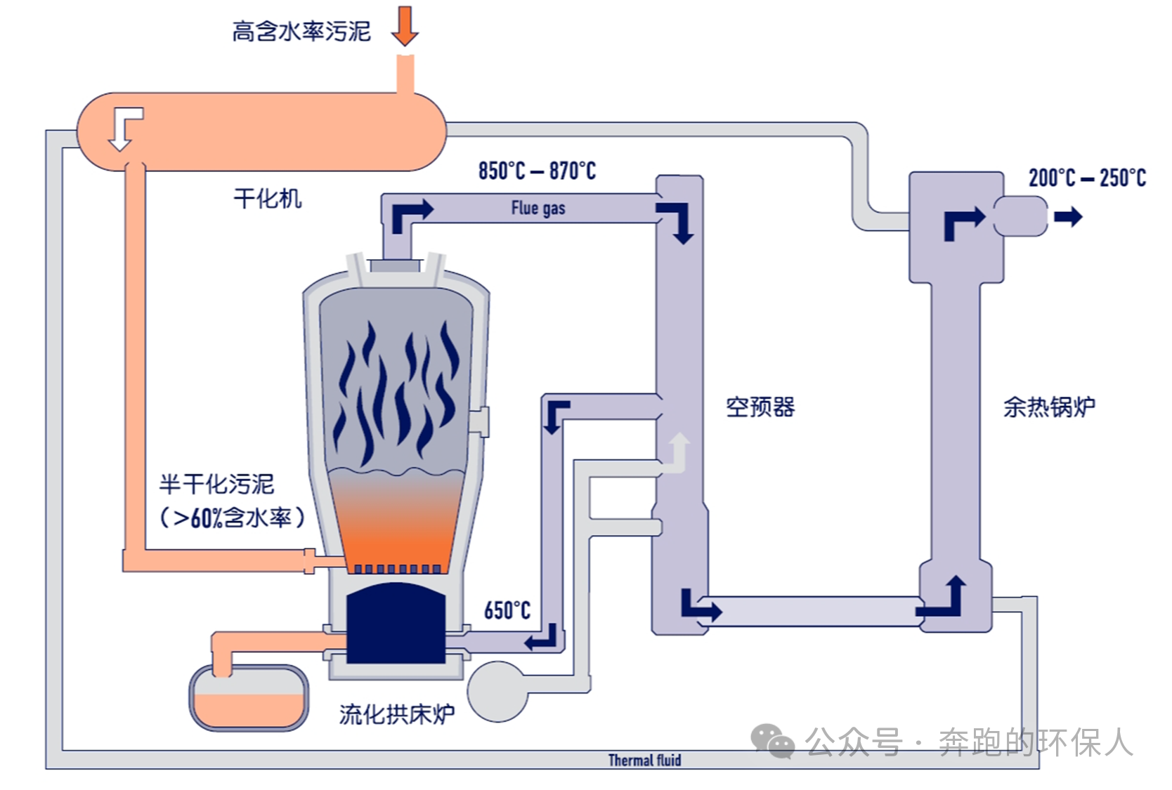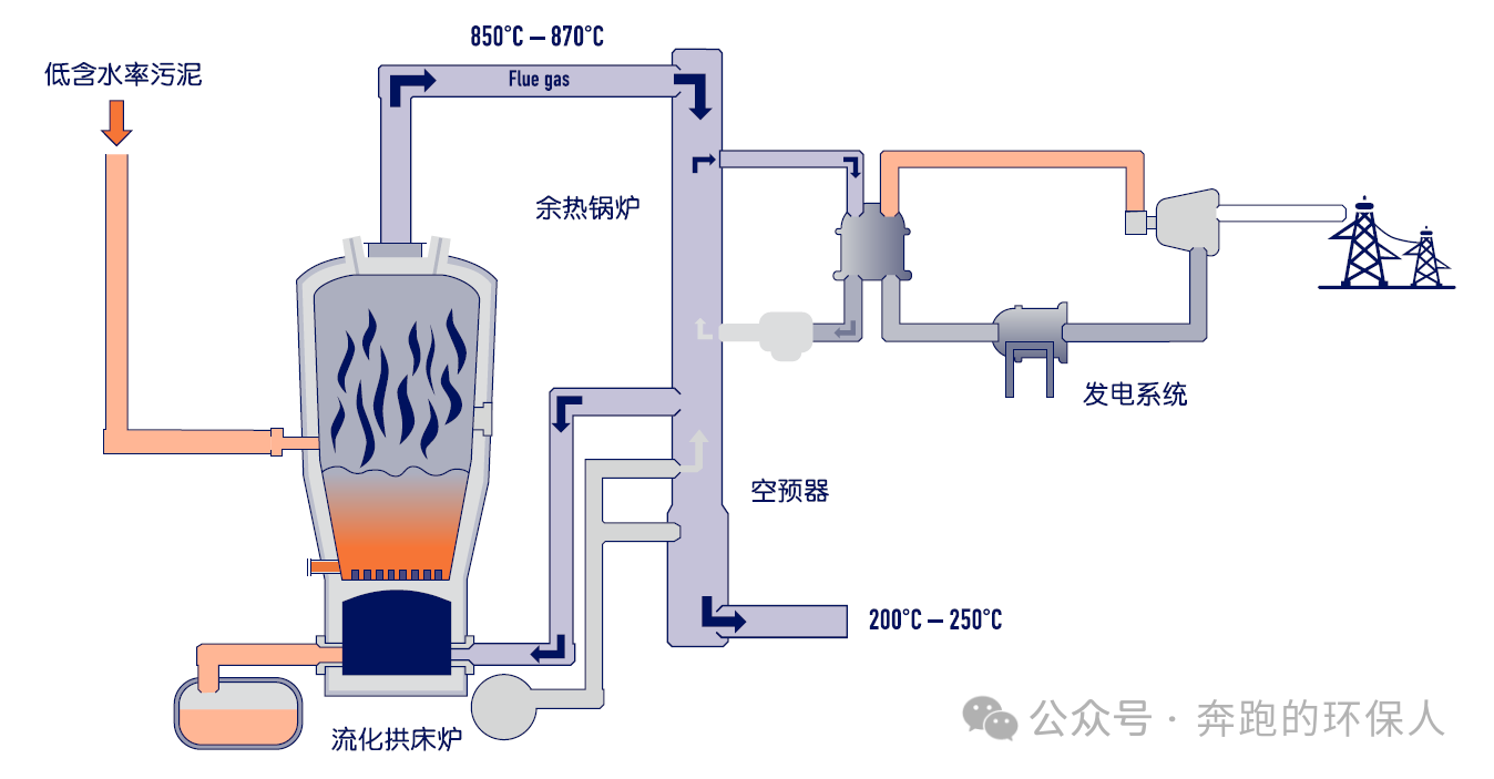 此路线适合进泥为80%含水率的污泥,先经过干化后含水率降低至60-65%左右,热污泥直接用泵密闭直接送入炉内焚烧处置,无需再设置中间料斗,减少热损耗。烟气通过两级能量回收,一级能量回收用于加热进入焚烧炉的流化风,二级能量回收用于污泥干化机的热源,其实后面还有个三级能量回收,主要是用于烟气再加热(消白)。