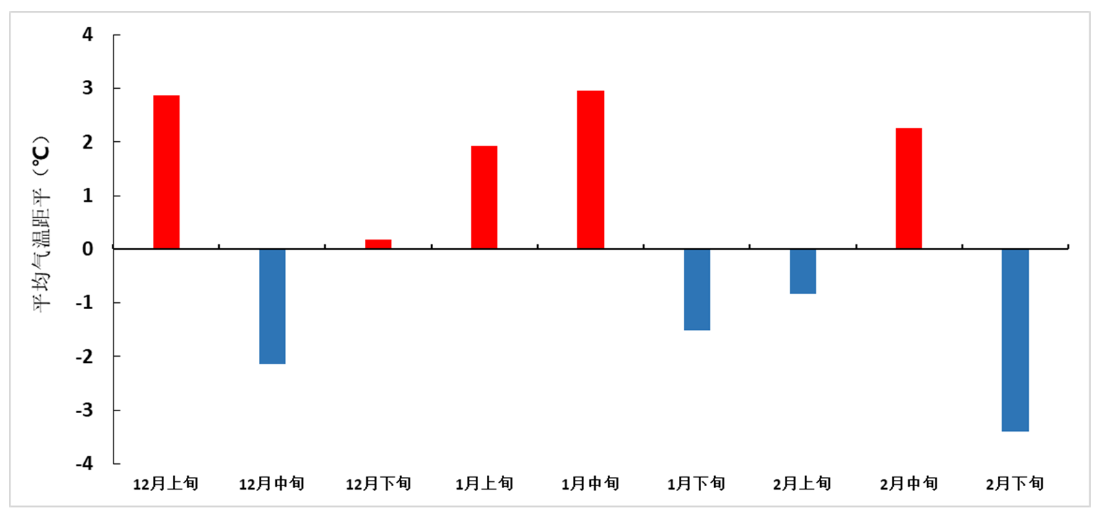 图2 2023/2024年冬季全国平均气温距平逐旬变化(单位:℃)