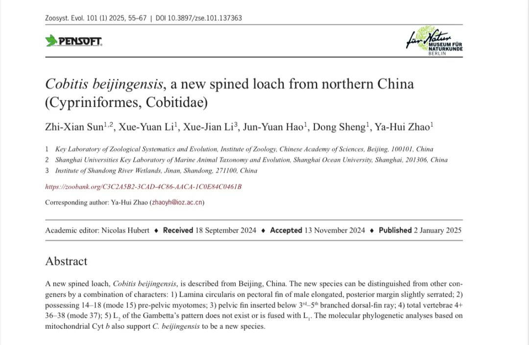 今年1月份,中国科学院动物研究所科研团队在国际著名动物学期刊《Zoosystematics and Evolution》(《动物系统学与演化》)上发表了采自北京地区的鱼类新物种——北京花鳅。这是自1981年以来,时隔40余年北京地区再度发现鱼类新物种。