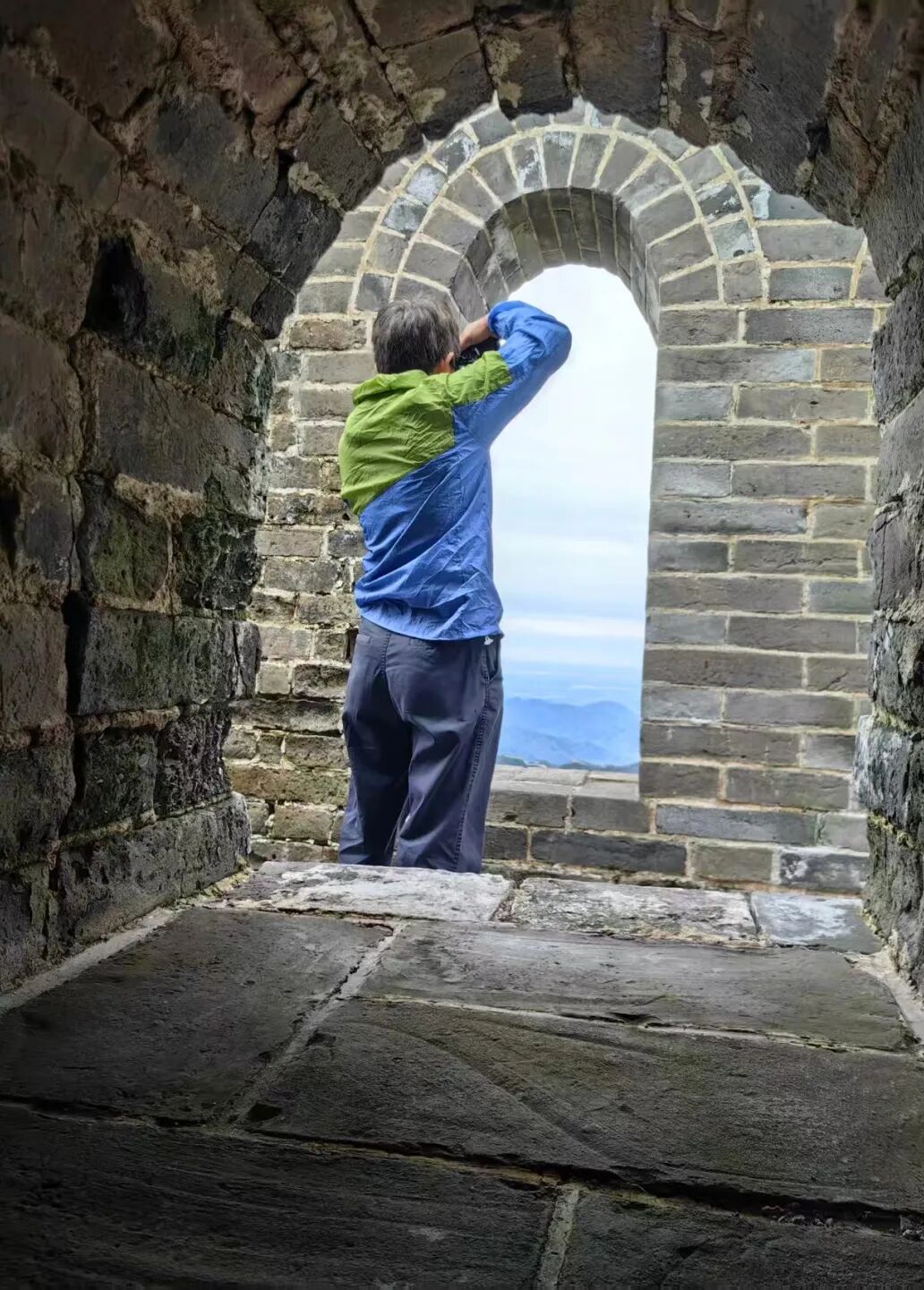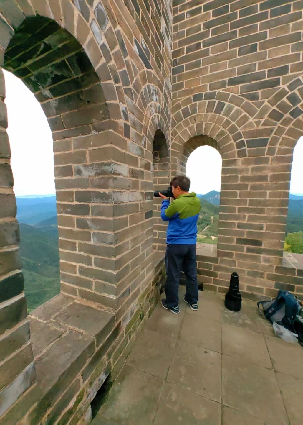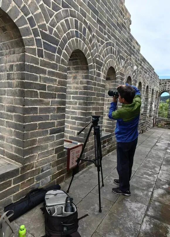 尽管没有太阳,但通透性极好,空气质量指数应该是个位数。老法师拿出600mm定焦镜头,稳稳地架在火焰山营盘遗址平台上,拍了几分钟后感觉拍摄角度不太好,就果断地抱起设备冲向了九眼楼。我在原地守着一堆的物品,在80-200mm、12-24mm两支镜头及手机之间来回切换着拍摄方式,比较着彼此之间的拍摄效果。20分钟后,我突然意识到600mm定焦镜头会不会太大,能否拍到长城与CBD同框?想问老法师是否需要送镜头过去,打开手机一看,没有信号。于是,我就把所有物品都带上,一步一挪地走向九眼楼。