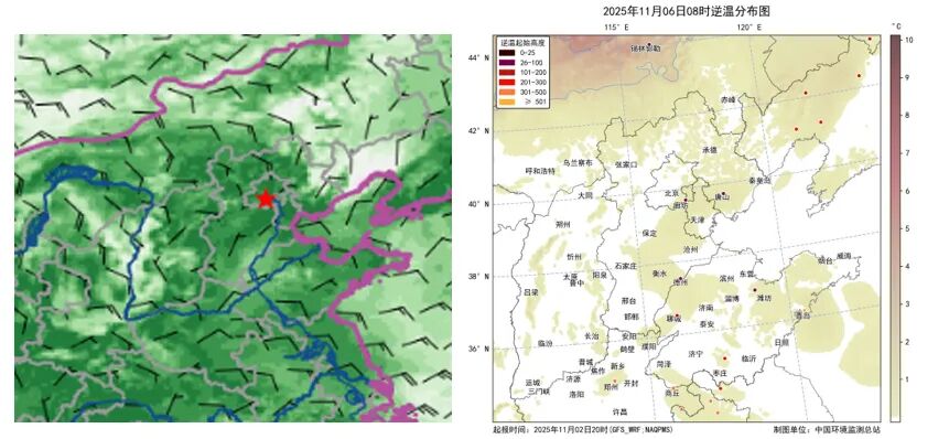 11月6日8时区域相对湿度(左)和逆温(右)预报