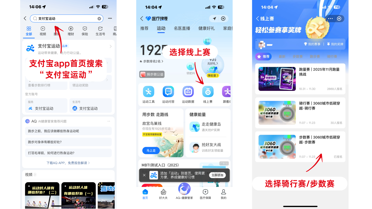 通过支付宝APP,搜索“支付宝运动”小程序进入“线上赛”专区报名参赛,或搜索“3060城市低碳穿越赛”小程序轮播页跳转报名。