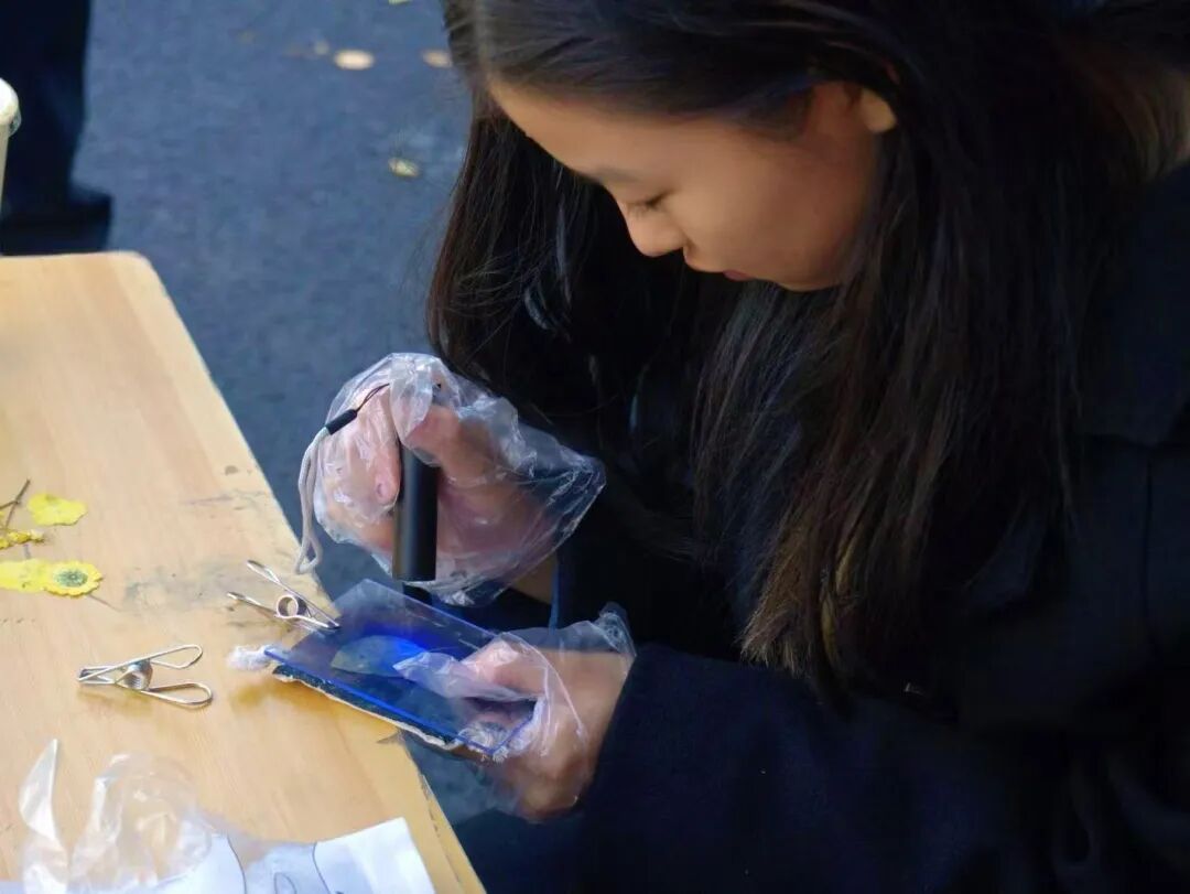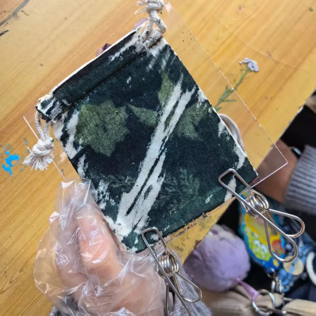 在志愿者的指导下,大家亲手调配蓝晒液、设计图案、覆盖植物标本并进行曝光处理。指尖流转之间,一件件印有银杏叶、月季花瓣等自然元素的蓝晒香囊逐渐成形。这些香囊不仅是参与者与自然对话的独特信物,也成为非遗文化与草木灵韵交融的生动载体。
