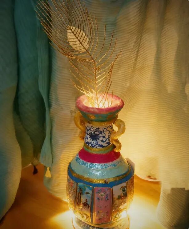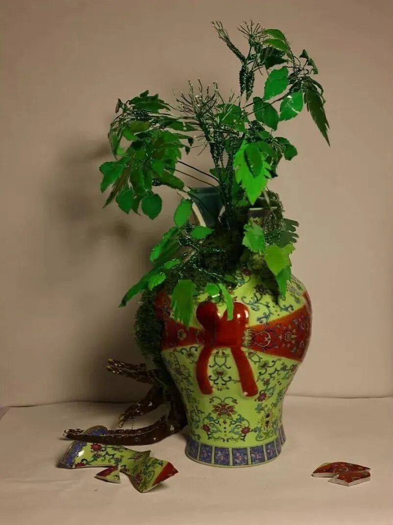 作者以“粉彩蕃莲纹包袱式瓶”为灵感,选用废弃静物瓶、旧画布、当归枝等材料,通过手工重组与再造,将破碎瓷片与当归根系交织于苔藓底座之上。