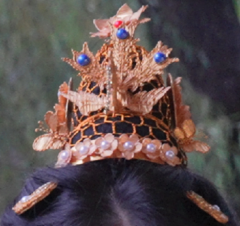 作品复刻明代女性䯼髻头饰,以铝丝为骨、玉米皮为面,将农业废料转化为传统首饰。通过拧结、掐丝等工艺,让废旧材料承载千年服饰文化,打破“废品”与“文物”的界限,展现传统之美在当代的重生。