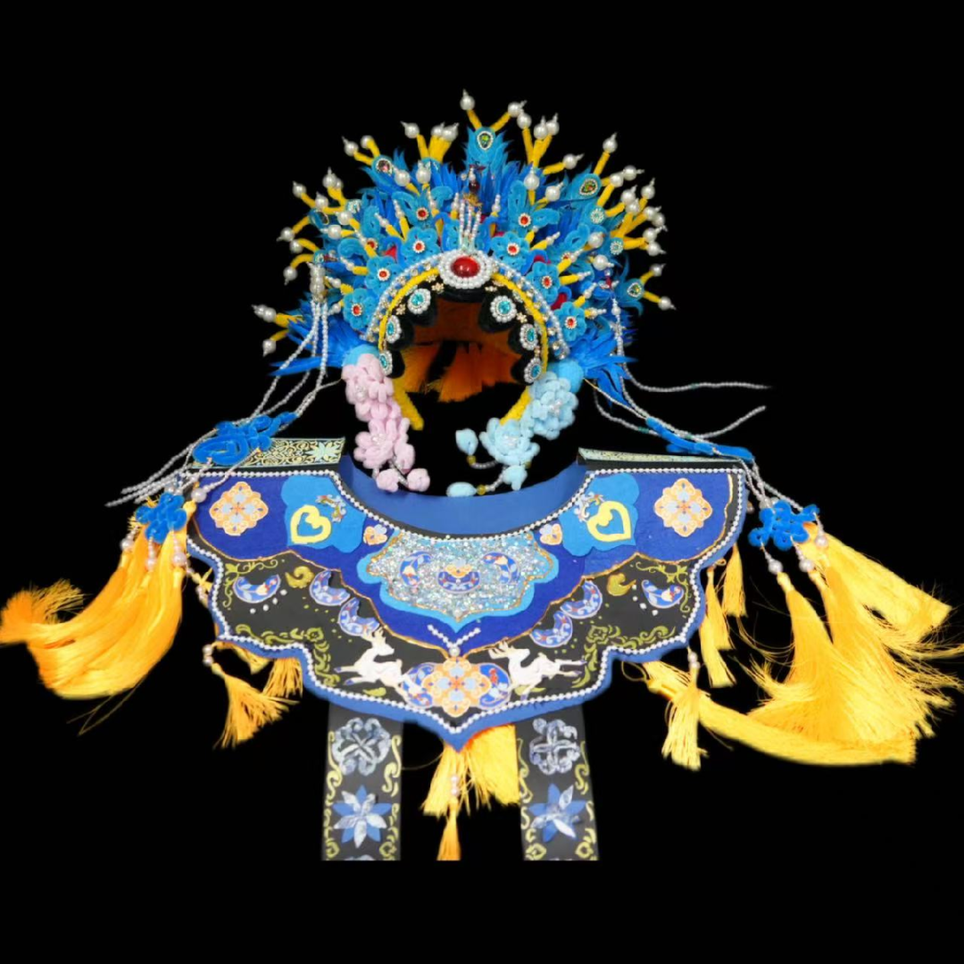 作者选用扭扭棒、仿珍珠等日常废旧材料,通过弯折、缠绕与拼接,匠心复刻传统贵妃凤冠与云肩。作品将非遗纹样与现代手工融合,让废弃材料焕发华彩,在亲手创造中实现从“历史旁观者”到“文化传承者”的身份转变。