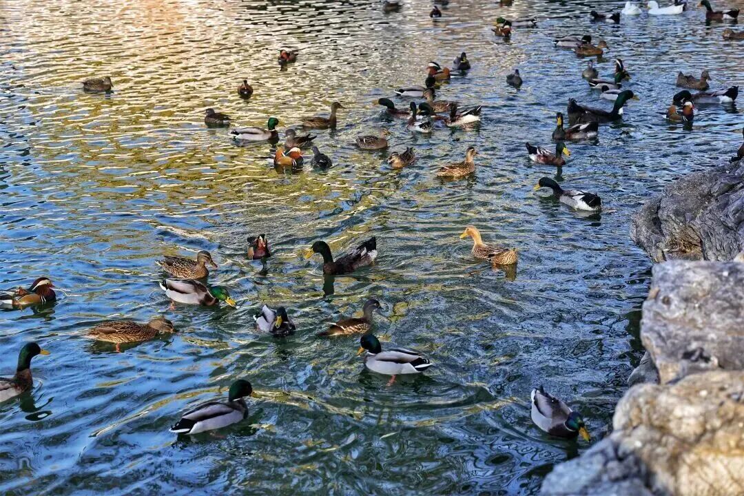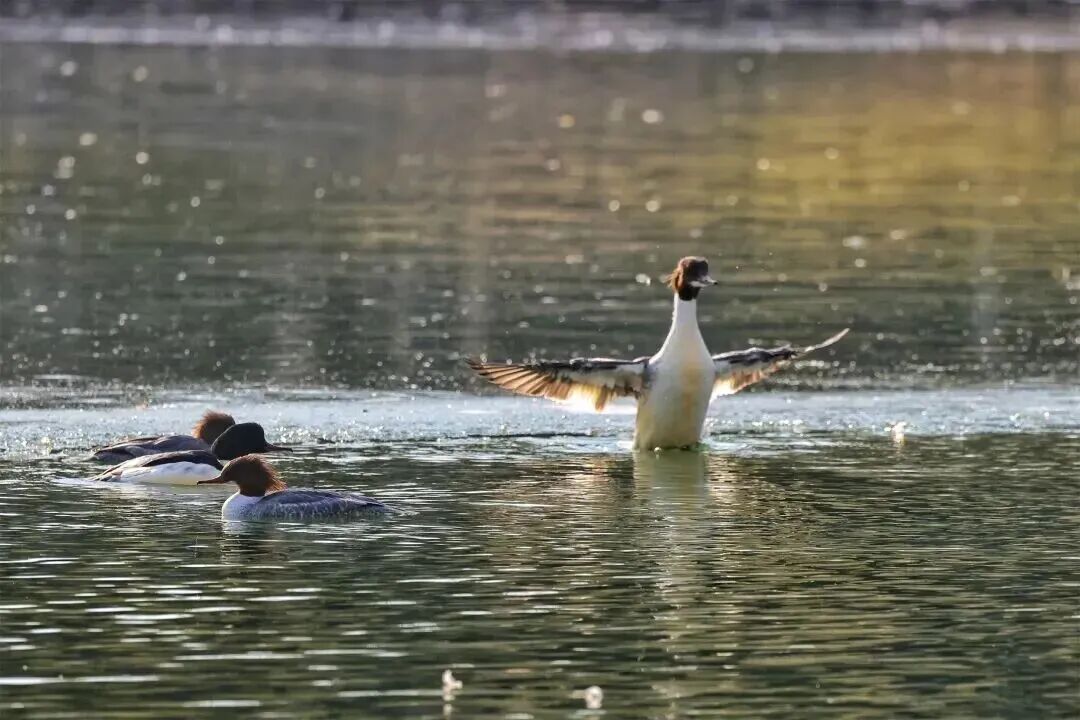 初冬的龙潭公园,湖中央十多只秋沙鸭正自在游弋,秋沙鸭身侧的鸳鸯、䴙鹈和绿头鸭是这里的“常驻居民”。它们三五成群,或在冰缝间戏水,或蜷在湖心岛休整,为初冬增添了灵动生机。
