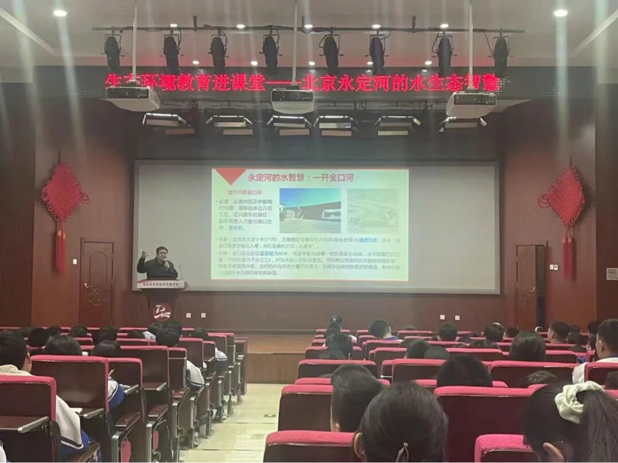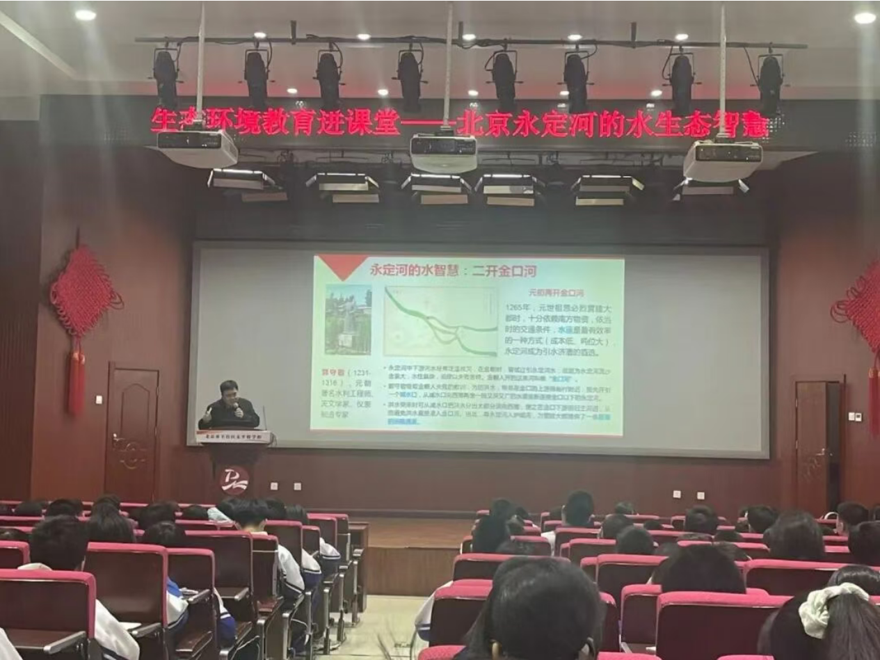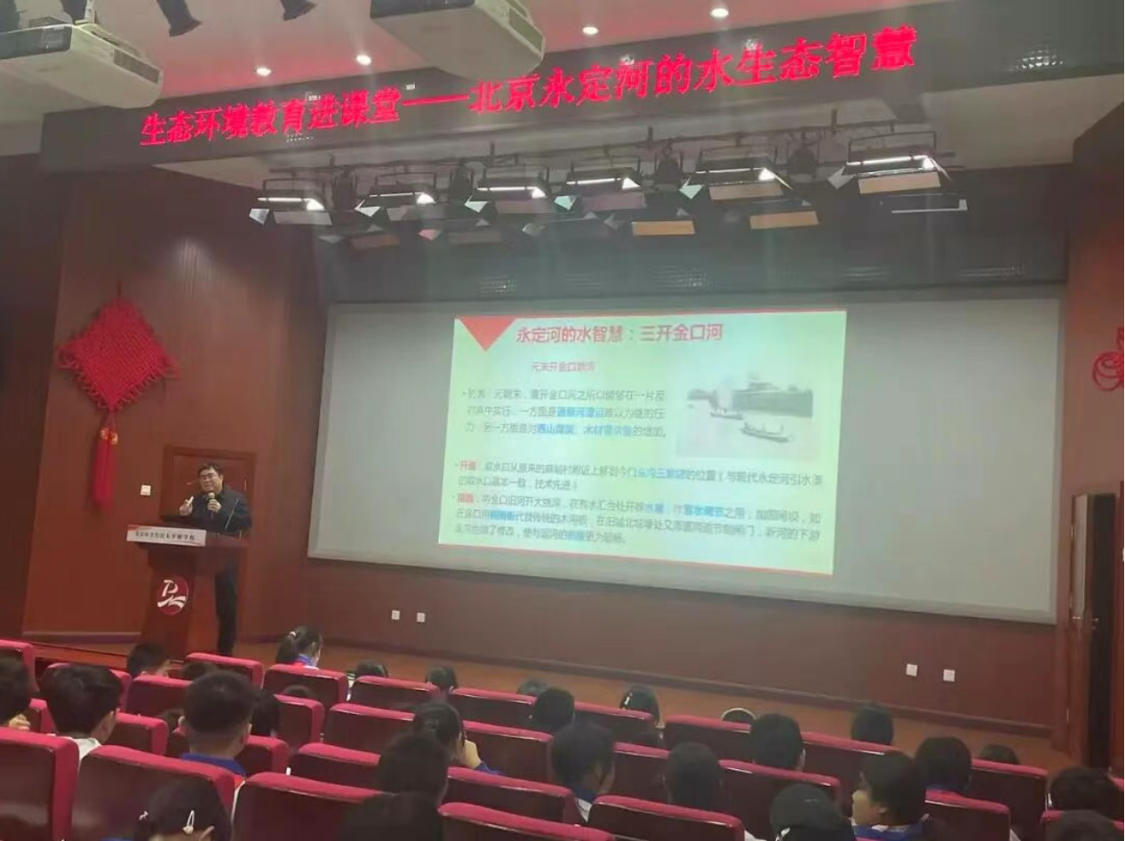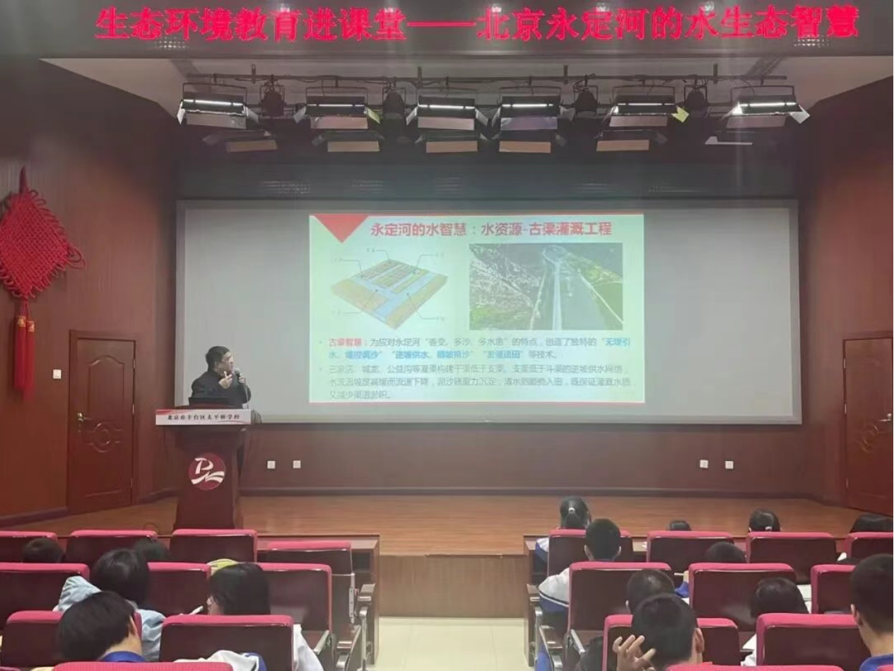 在世界水日·中国水周到来之际,北京市生态环境保护宣传中心生态环境教育进课堂活动走进北京市丰台区太平桥学校,邀请北京大学的刘文老师带来了一场《北京永定河的水生态智慧》主题课程讲座,让同学们在古今生态智慧的交融中,感悟水生态保护的重要意义,厚植绿色环保情怀。此次活动得到了丰台区生态环境局、丰台区教育委员会的大力支持,丰台区教委组织全区中小学生通过云课堂参与课程学习。
