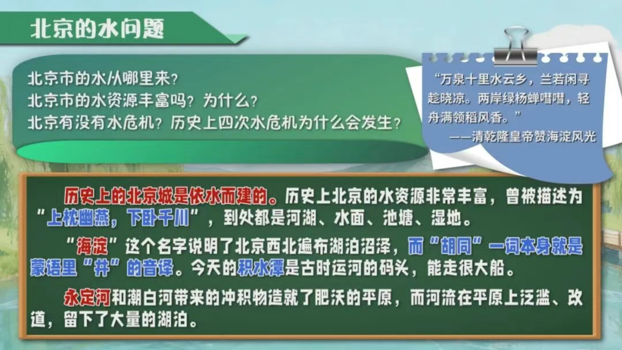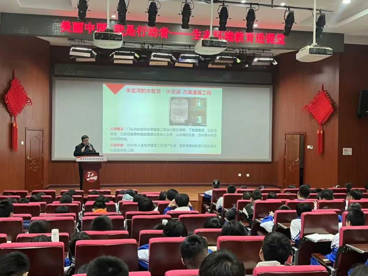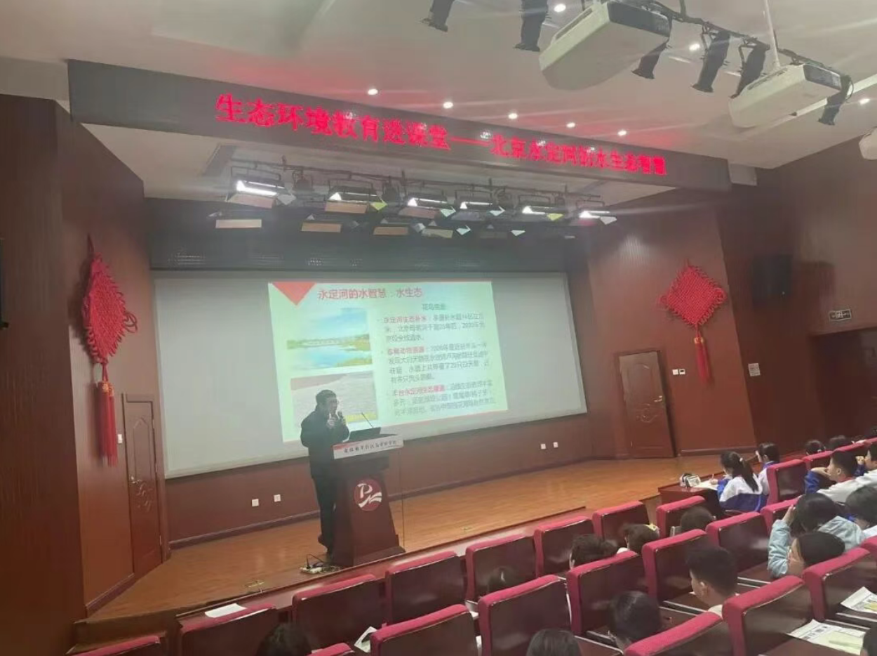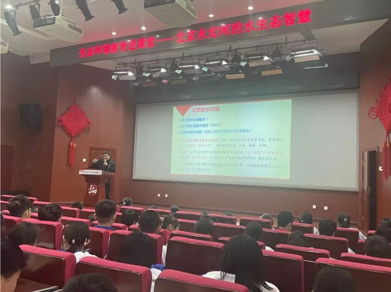 在世界水日·中国水周到来之际,北京市生态环境保护宣传中心生态环境教育进课堂活动走进北京市丰台区太平桥学校,邀请北京大学的刘文老师带来了一场《北京永定河的水生态智慧》主题课程讲座,让同学们在古今生态智慧的交融中,感悟水生态保护的重要意义,厚植绿色环保情怀。此次活动得到了丰台区生态环境局、丰台区教育委员会的大力支持,丰台区教委组织全区中小学生通过云课堂参与课程学习。