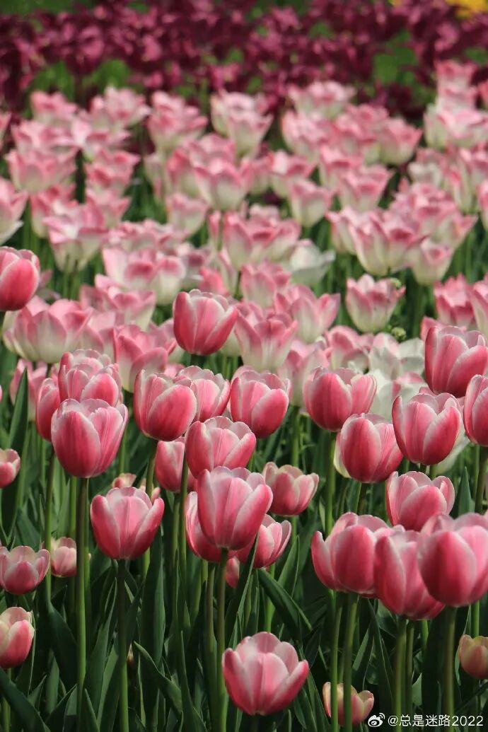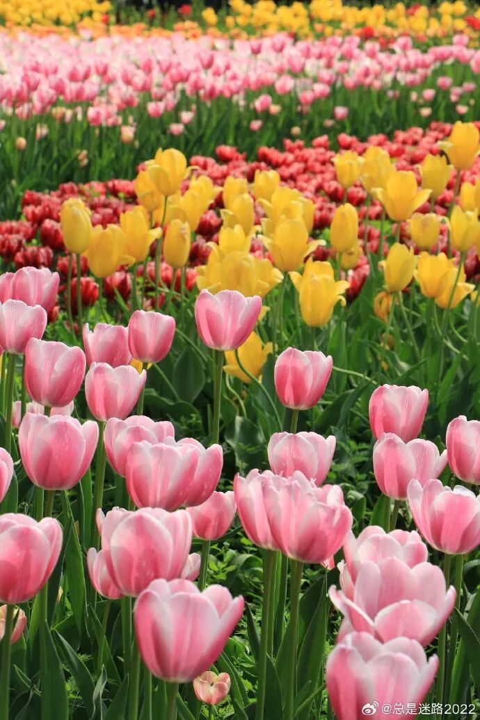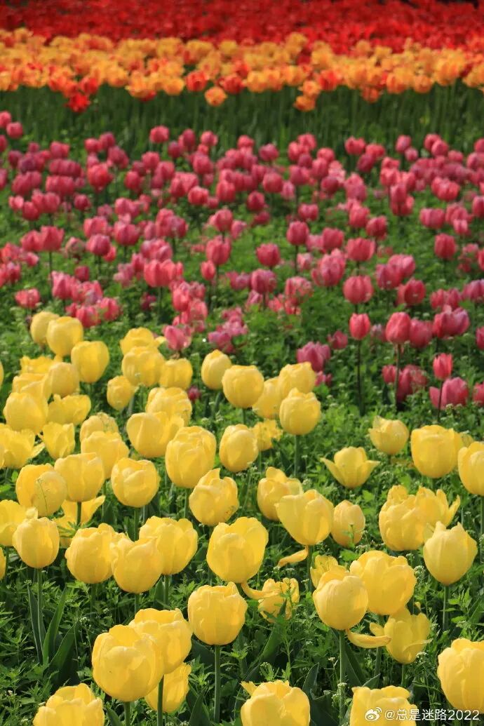 国家植物园的郁金香白的像雪,粉的像霞,金的像傍晚的光。阳光打穿花瓣,整片亮得像琉璃杯盏。红的烈,橙的暖,像青春的日子铺在脚下。