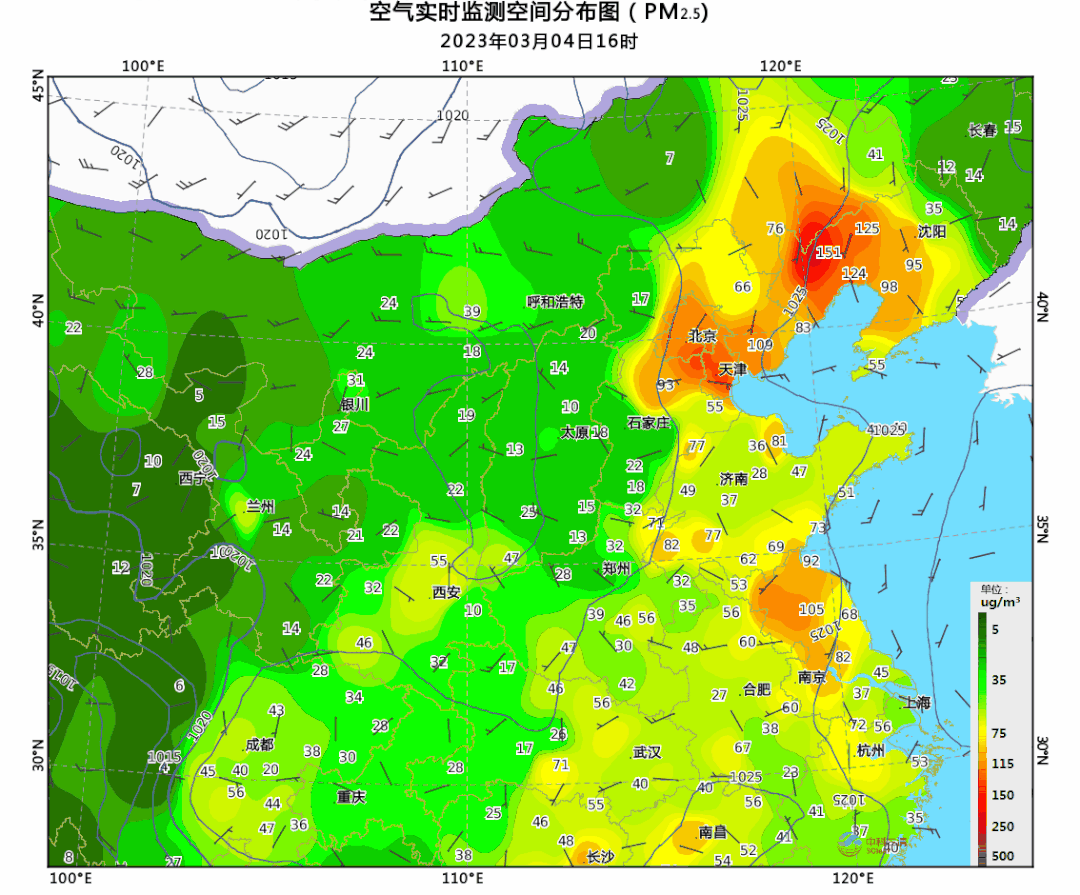 2023年3月3-5日全国PM2.5浓度变化