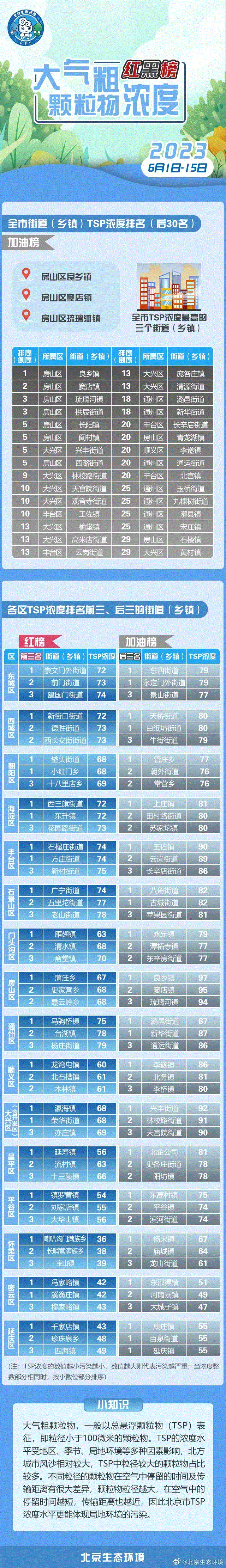 北京市通报6月1日-15日街道(乡镇)大气粗颗粒物浓度排名