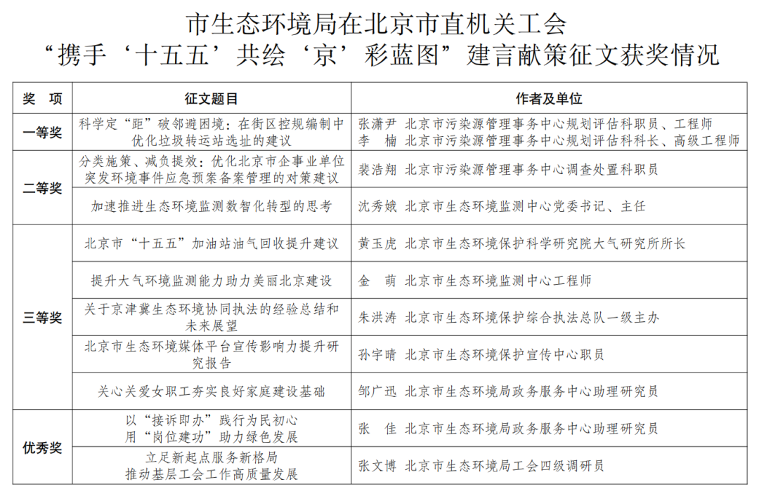 11月26日,北京市直机关工会公布了以“携手‘十五五’ 共绘‘京’彩蓝图”为主题的建言献策征集活动的获奖名单。其中,北京市生态环境局在活动中斩获佳绩,荣获一等奖1篇、二等奖2篇、三等奖5篇、优秀奖2篇。